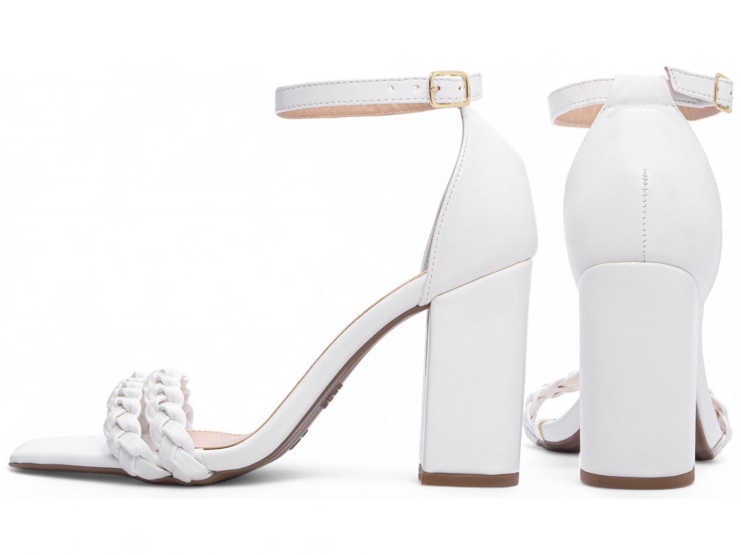 Enfeite: Tiras trançadas em Napa Branco e fivela de metal na cor dourado.