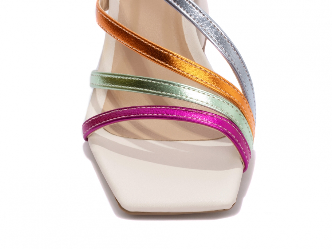 Palmilha: 8 mm de Espessura, Espuma em EVA, Revestida em Napa Off White e Taloneira Napa Bege.