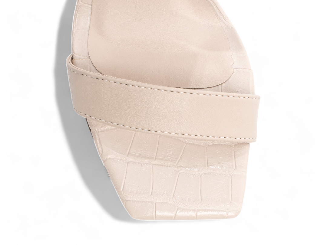 Palmilha: 8 mm de Espessura, Espuma em EVA, Revestida em Napa Croco Bege e Taloneira Napa Bege.