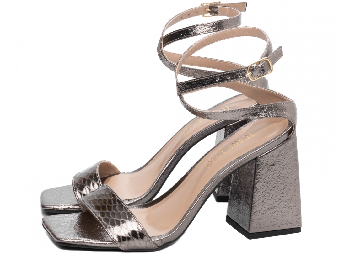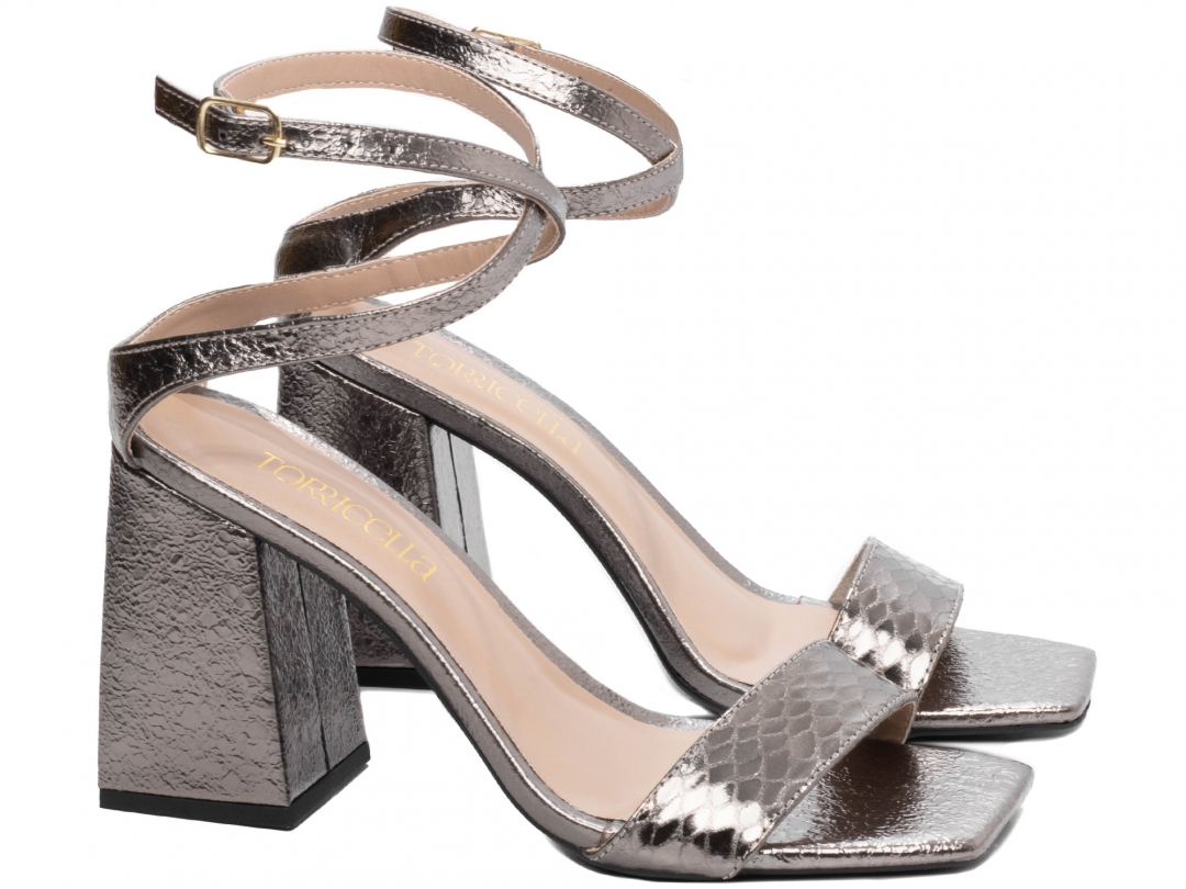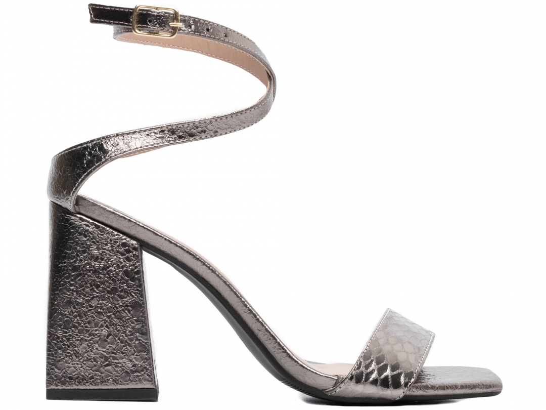 Salto: Grosso com 9 cm de Altura Revestido em Napa Metalizado Prata Velho.