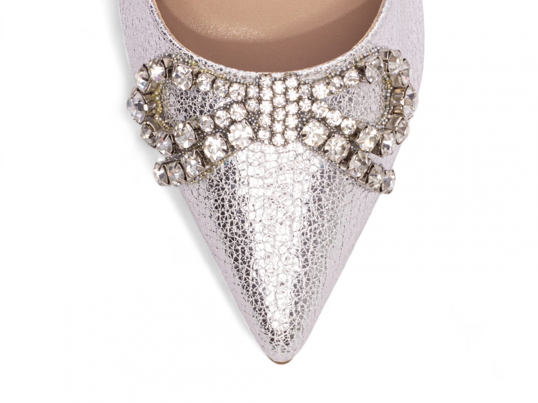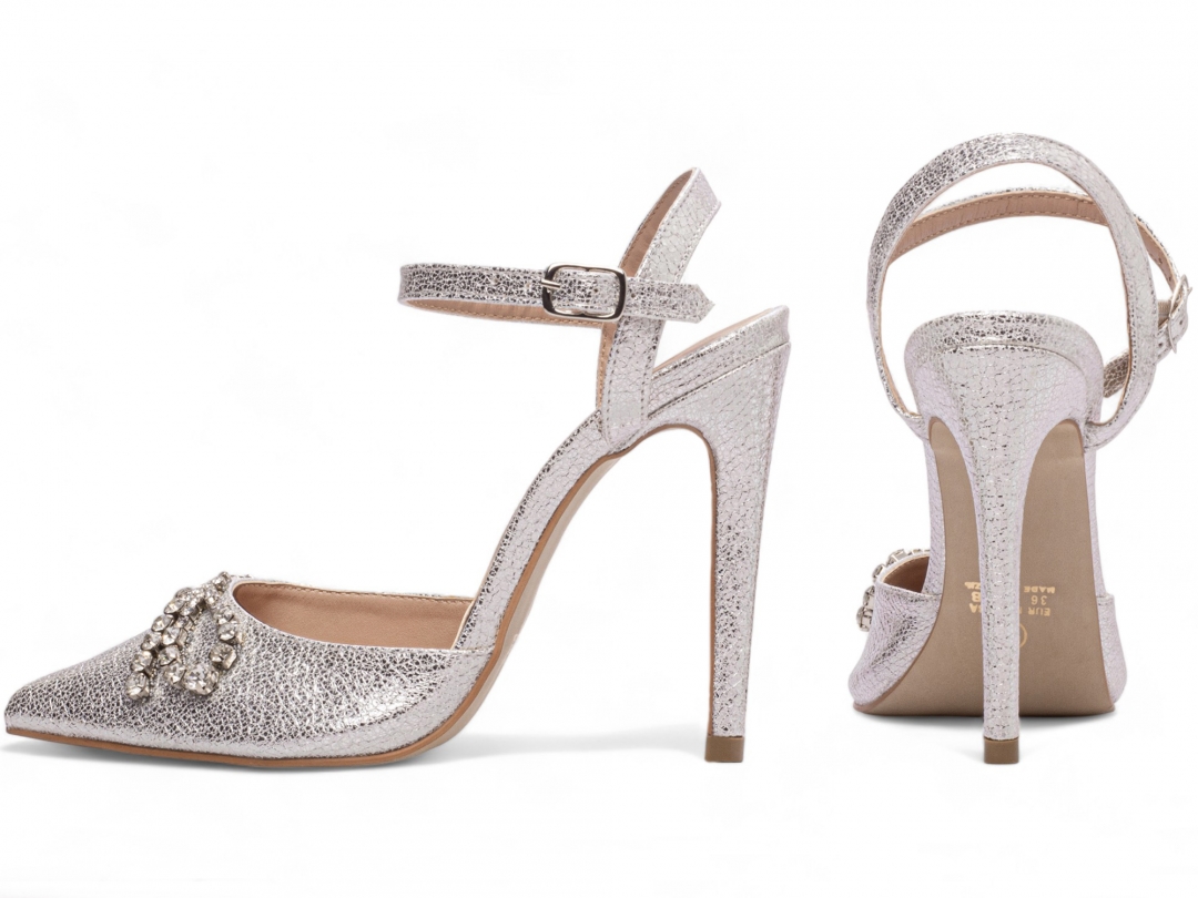 Palmilha: 8 mm de Espessura, Espuma em EVA, Revestida em Napa Metalizado Prata e Taloneira Napa Bege