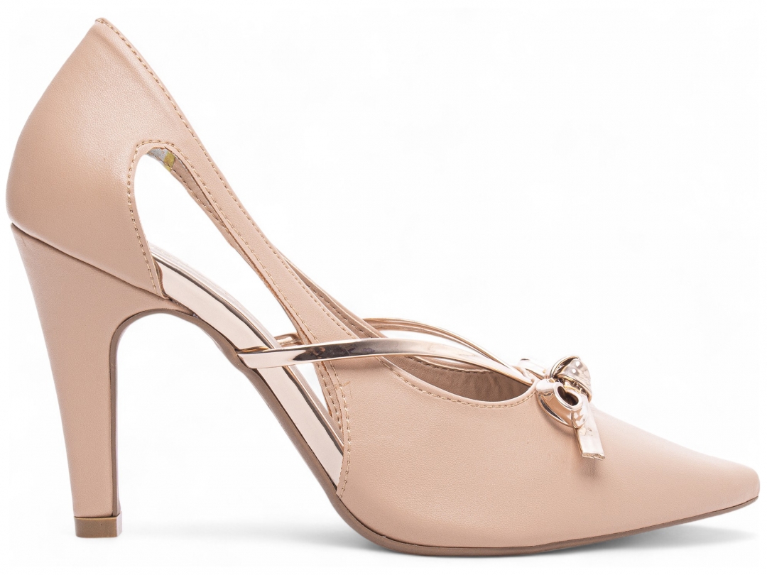 Palmilha: 8 mm de Espessura, Espuma em EVA, Revestida em Metalizado Speechio Rosê e Taloneira Napa Bege
